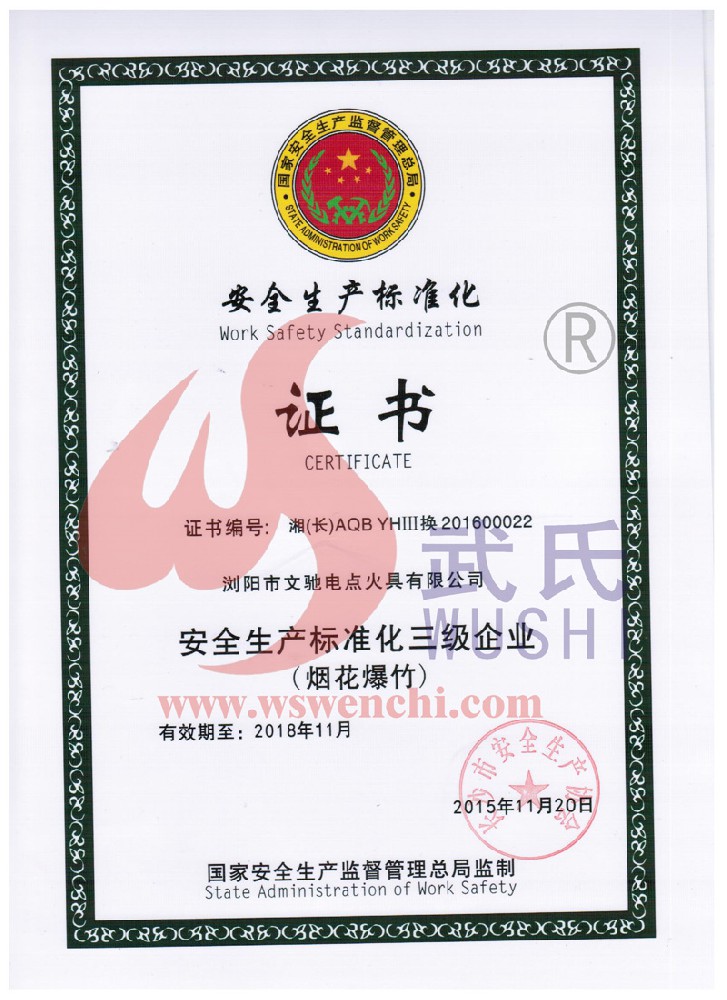 瀏陽市文馳電點火具有限公司(原培文電子點火器材廠),創建于1998年,是一家專業從事研制銷售電子點火產品的民營科技企業,是我國第1枚煙花用電點火頭生產者,是《煙花爆竹電點火頭國標》牽頭起草單位。公司位于中國“煙花之鄉”湖南省瀏陽市,地理位置優越,交通便利。    我公司研制的對象是用電能引燃火藥、做機械功等預定功能的一次性使用的元件或裝置,包括電點火頭(英文名ElectricMatch or Electric Igniter,中文俗稱“電火柴”或“電發火頭”)、電點火管和延期電點火管;我們估且在以后的產品技術欄中將我們研究的產品統稱為電點火具,將電點火器看成是用于提供和控制供給電點火元件點火的電能器材;我們研究的電點火橋路有橋絲式、無橋絲···